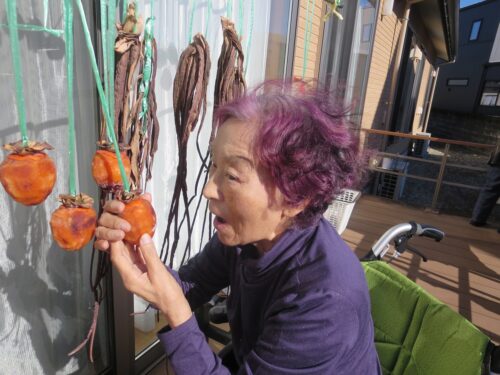 さわやかグループホーム なすしおばら すいせんユニットの様子 2025-12-01 2025-12-01 先日皆さま作った『干し柿』の出来具合をチェックして頂いてます。 かぶりついて見る仕草をなさってお茶目なお方です(*^_^*) 完成にはもう少し時間がかかるようなのでお楽しみはもう少し先になりました。