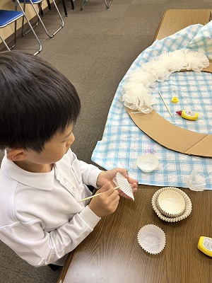 この日は、季節の飾り「リース作り」に挑戦! 写真のように、土台となる大きな段ボールの輪に、白いフリル状の素材や、小さなカップ(※紙製のマフィンカップ)を花びらに見立てて飾りつけていきます。