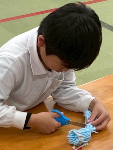 毛糸をしばって束にしたら、先を切ってポンポンにします。