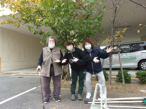 と、言うことで「落ち葉かき集め隊」を発足!!早速入居者様と一緒に清掃しました。