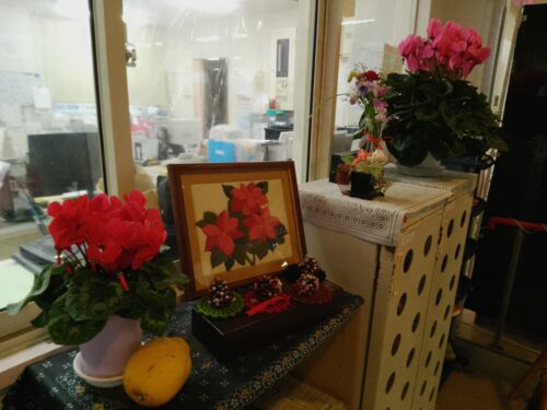 かりんやシクラメン、田中様のご家族が持って来て下さった飾りで華やかです😀