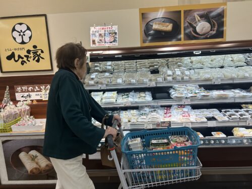 施設用の買い物もあったので一緒に手伝って下さいました。いろんな商品を見て「おいしそうね。若松に住んでいた時はよくここで