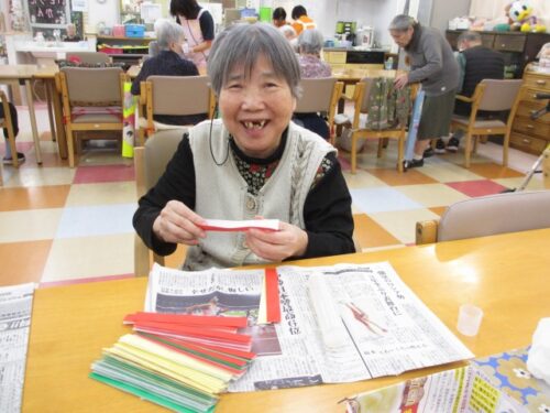 赤、黄色、緑の折り紙で、