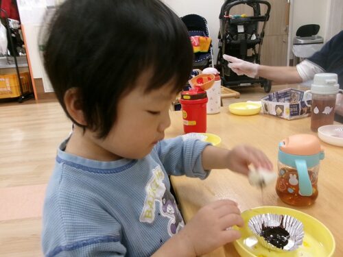 そこにチョコクリーム、ケーキシロップ、イチゴジャムをつけていただきます!