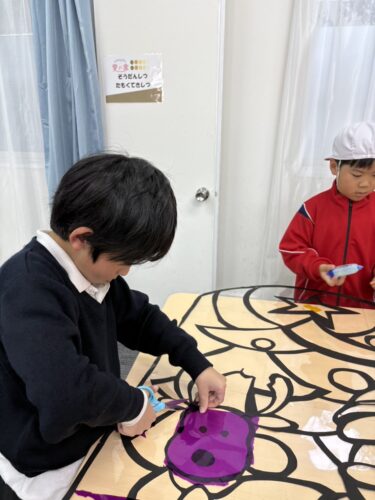 本日は工作活動でステンドグラス製作を児童皆で共同製作を行いましたのでその様子をお伝えいたします。