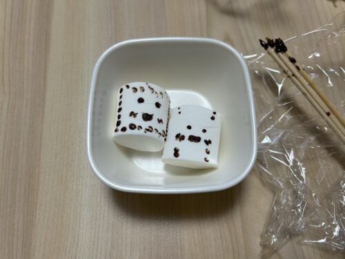 また、自分でマシュマロをデコレーションしたい児童が楽しめるよう、チョコと竹串を用意し、好きな顔を描けるようにしました✍️