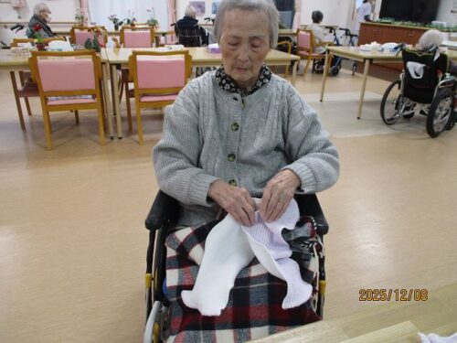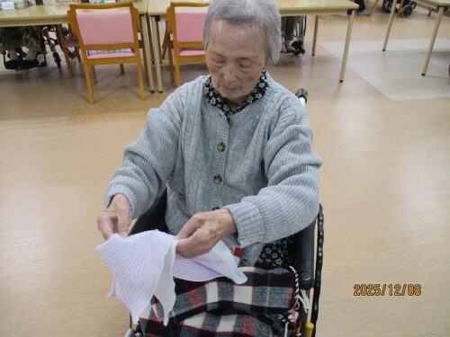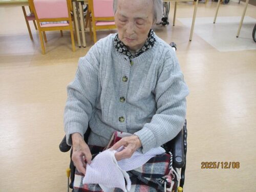 午後からお風呂で使用する洗身タオルたたみを手伝っているところを発見👀