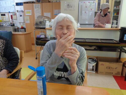 浴室で髪を乾かした後に,職員と席に行きこちらもお顔の保湿。