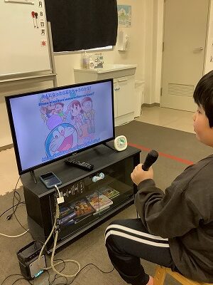 今日のテーマは「カラオケ大会」! テレビ画面に映る映像に合わせて、好きな曲を歌ったり、リズムに乗ったりして大盛り上がりでした!