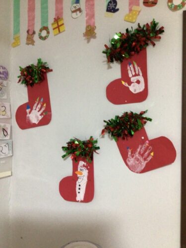 靴下の形をした画用紙にキラキラのテープを貼ってかわいく💓