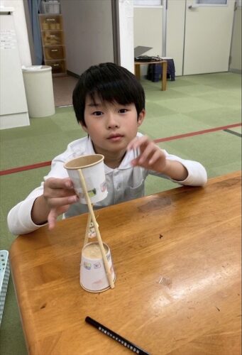 その後紙コップにワイヤーを片方を通して、小さいストローをワイヤーに通します!