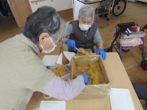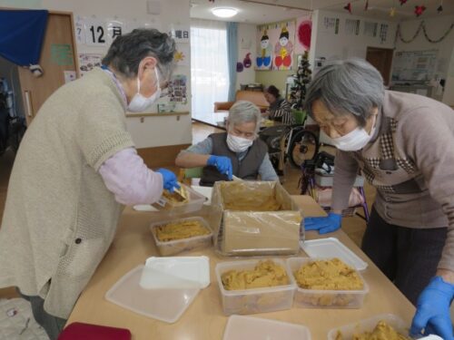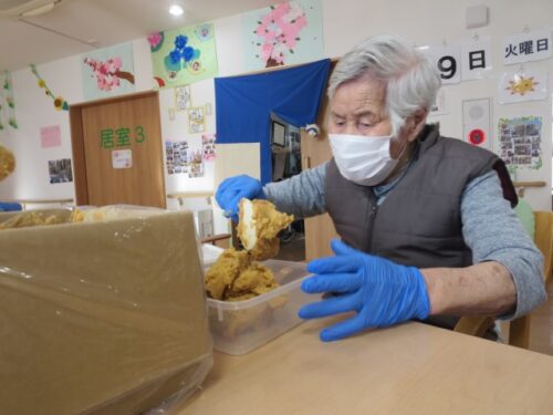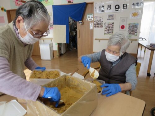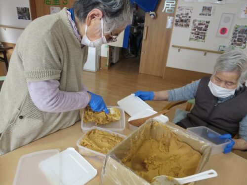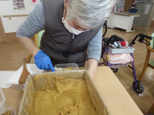 10㎏の箱入りのお味噌を皆さまで小分けにして頂いてます。