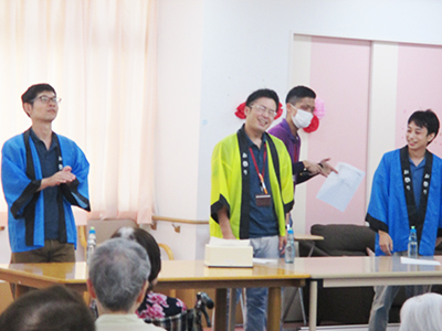 さわやかいそうだ館の外周歩行は入居者様の習慣の一つになっています。毎日、晴れた日は他の入居者様と共に、屋外歩行に行かれ園芸の水やりや草むしり・ゴミ拾いまで職員と一緒に参加され入居者様の楽しみのひとつになっています。屋外にイスを準備し、みなさんで歌を歌い、日向ぼっこで季節を感じて頂ける時間にもなっています。