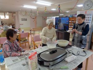 いわつき館では、調理レクにも力を入れています。入居者様、職員が一緒に調理し、調理の中で入居者様同士のコミュニケーションの場にもなっております。