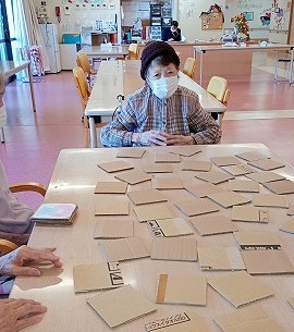 さわやか大畠参番館では月次のお誕生会に合わせ「ビンゴゲーム」を開催しております。縦・横・斜め どれかのラインが揃えばビンゴ!皆様真剣な眼差しで番号を探されてカードに穴を開けて参ります。景品は生活必需品を筆頭に季節に合った物をご用意しており景品を選ぶ楽しみもある様で、とにかく定番の大人気レクです。