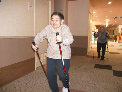 さわやか桜館では、皆様が楽しんで続けられる生活リハビリを行っております。ノルディックウォークはとても姿勢が良くなり、身長も伸びます。楽に歩けるようになるため、とても好評です。毎週行う習字ではお互いに教えあったりしてとても楽しまれております。