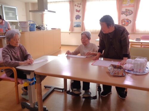 毎朝9時から約30分ほどかけて入居者様に元気にそして前向きに一日を生活していただくために活力朝礼という取り組みを行っております。朝から『明るく元気よく』をテーマにラジオ体操から始まり声出しをします。身体が温まったら次に簡単な計算問題はじめ漢字クイズなど認知症の予防や脳を活性化させるような取り組みを実施し、その後は入居者様お待ちかねの職員が工夫を凝らしたレクリエーション♪