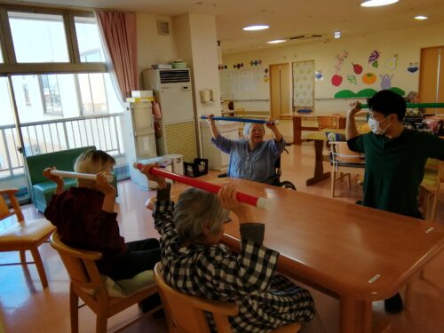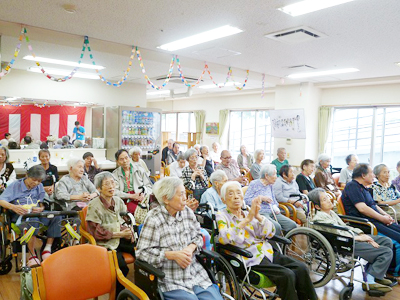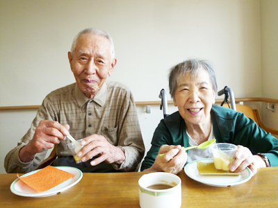多目的レクリエーションでは、書道・将棋・貼り絵など、ご入居者様が自ら選び参加出来るレクリエーション活動を実施しています。また別の週には、季節感を味わって頂けるおやつをご入居者様と一緒に作り、喫茶店をオープンしています。その他、餃子レクリエーション、カラオケ、DVD鑑賞など多彩なレクリエーションを開催しています。
