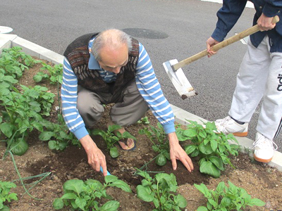 さわやかゆう輝の里では、畑作りにも力を入れています。現在、ジャガイモ、きゅうり、ミニトマト、ゴーヤなどを作っています。季節に合わせ、作ったものを食事で提供させていただいています。
